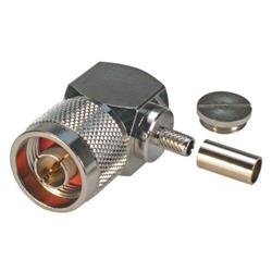 This Type N male connector has been specifically designed for a crimp style attachment to RG142/RG223/RG400 style cable. The body and ferrule are machined and nickel plated for superior corrosion resistance and durability. Gold plating is utilized on the center pin for low contact resistance. The right angle design allows for use in limited space applications.